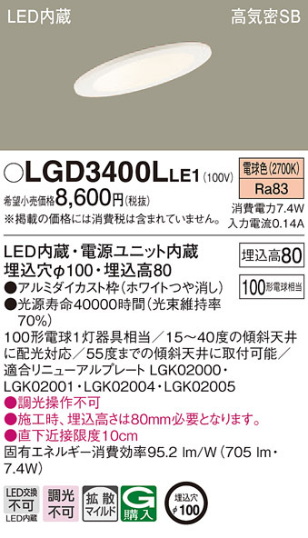■パナソニック LGD3400LLE1 ダウンライト100形拡散電球色 Panasonic