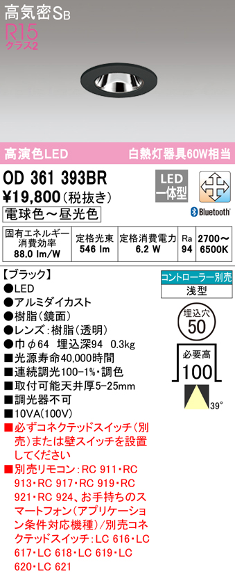 ■(送料無料) オーデリック OD361393BR ダウンライト LED一体型 電球色〜昼光色 高気密遮音SB形 Bluetooth対応 ODELIC