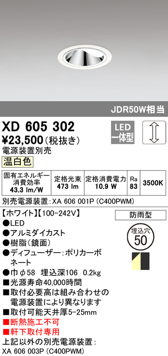 ■オーデリック XD605302 ダウンライト LED一体型 温白色 調光 M形(一般形) ODELIC