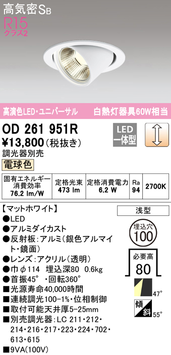 ■オーデリック OD261951R ダウンライト LED一体型 電球色 調光 高気密遮音SB形 ODELIC