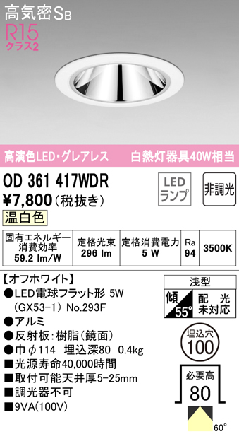 ■オーデリック OD361417WDR ダウンライト LEDランプ 温白色 非調光 高気密遮音SB形 ODELIC