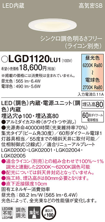 ■パナソニック LGD1120LU1 ダウンライト60形調色集光W Panasonic