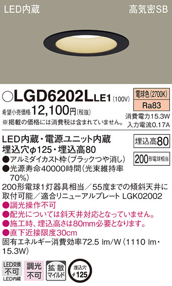 ■(送料無料) パナソニック LGD6202LLE1 ダウンライト200形拡散電球色 Panasonic