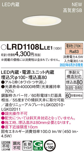 ■パナソニック LRD1108LLE1 ダウンライト60形電球色拡散 Panasonic