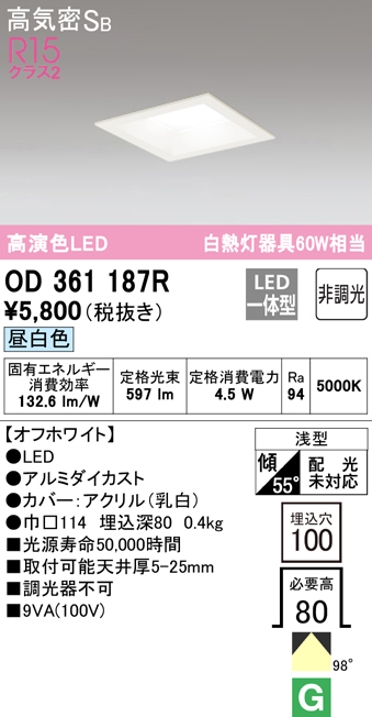 ■オーデリック OD361187R ダウンライト LED一体型 昼白色 非調光 高気密遮音SB形 ODELIC