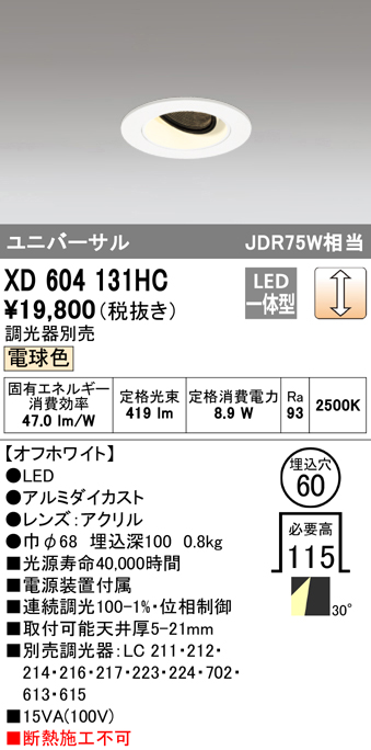 ■(送料無料) オーデリック XD604137HC ダウンライト LED一体型 電球色 調光 M形(一般形) ODELIC