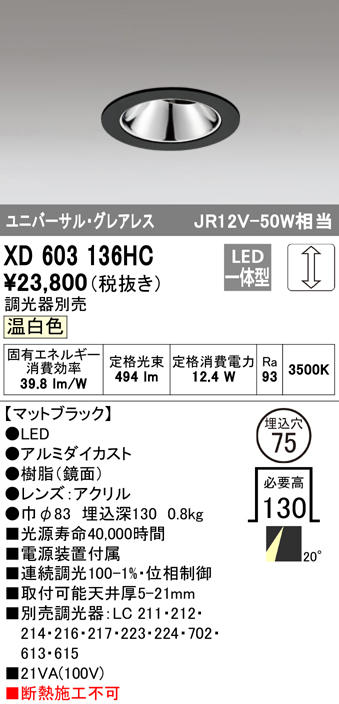 ■(送料無料) オーデリック XD603136HC ダウンライト LED一体型 温白色 調光 M形(一般形) ODELIC