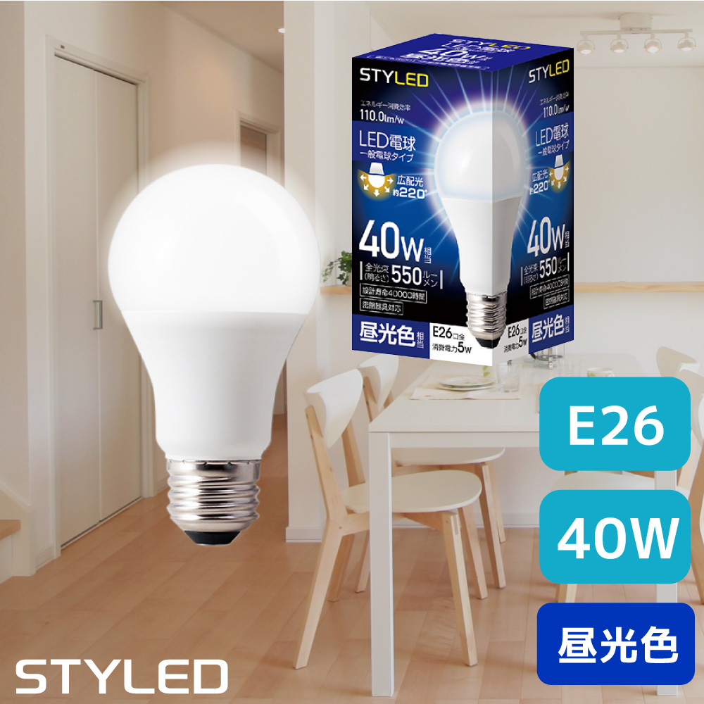■【昼光色・E26口金・40W相当】LED電球 E26口金 40W相当 一般電球形 広配光タイプ 昼光色(550lm) 省エネ スポットライト