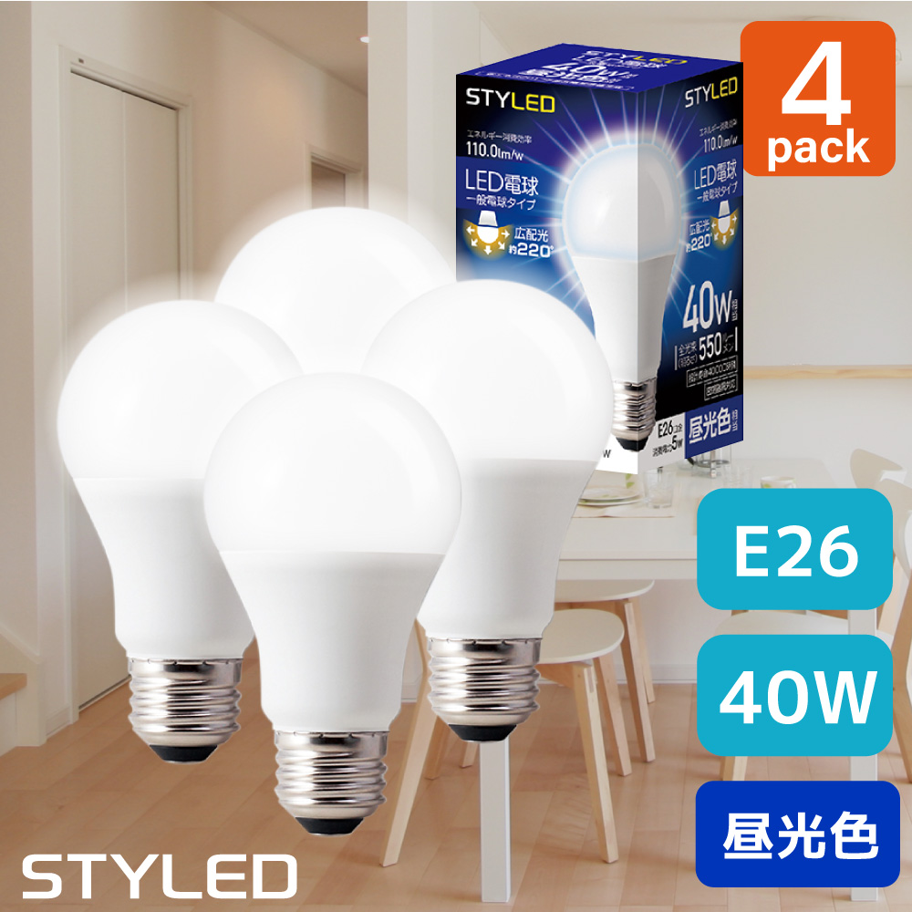 ■【4個セット・1個当たり299円】LED電球 E26口金 40W相当 一般電球形 広配光タイプ 昼光色(550lm) 省エネ スポットライト