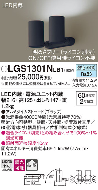 ■(送料無料) パナソニック LGS1301NLB1 スポットライト60形X2拡散昼白色 Panasonic