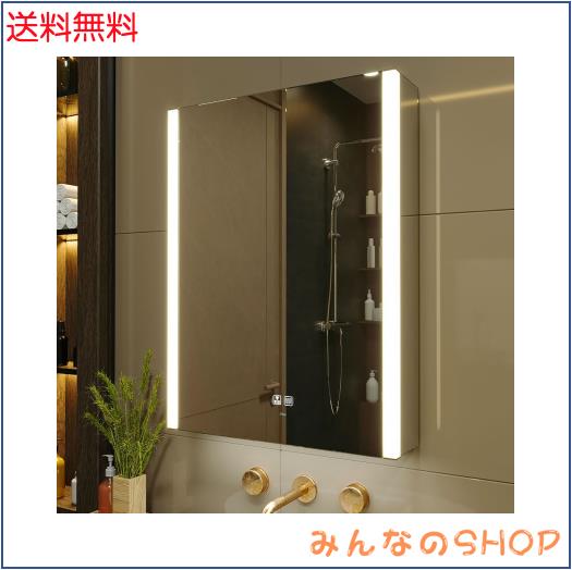■KWW LEDライト付きバスルーム薬キャビネット、曇り止め、調光可能、3色ライトメイクアップミラー、コンセント&USB、取り付け簡単、壁掛