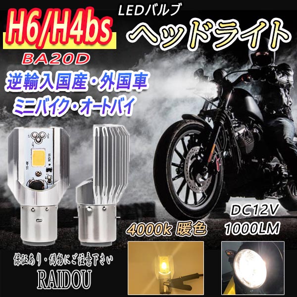 超高輝度のCOBLEDチップを搭載!ハロゲン球から省電力のLEDへ是非お試し下さい!【商品仕様】・商品サイズ:6.6cm×3.4cm ・電圧:DC12V・発光色:暖色4000k・ソケット:H6/H4bs・口金:BA20D・ルーメン数:Lo 800LM / Hi 1000LM・消費電力:Lo 4.3w / Hi 9.5w・色温度:4000k・数量:2本逆輸入国産・海外バイク・二輪バギー・四輪バギー等の汎用品です。汎用品の為、車種によってハイ ローが反対になる場合があります。その場合は配線入れ替えてご使用ください。また、取り付けには多少の加工が必要な場合がございます。純正ハロゲン球よりバルブが長くなっていますので、バルブがカバーに干渉する場合があります。必ず実車の装着部の各寸法、形状などをご確認ください。車種別の取り付けサポートはしておりませんので取り付けに関してはインターネット検索にてご確認ください。