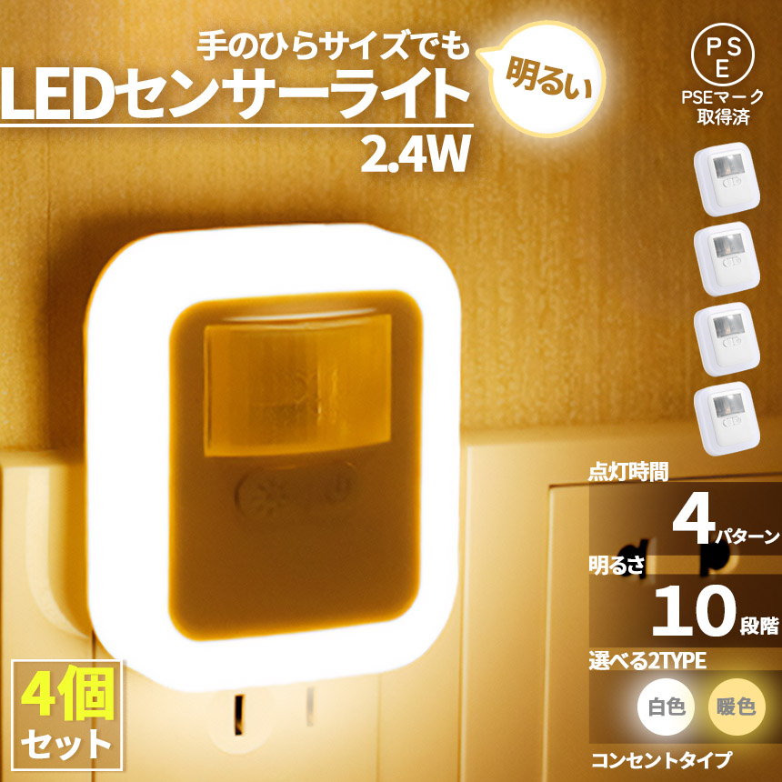 ■センサーライト フットライト 人感 4個セット コンセント式 室内 明るさ調節 点灯時間設定 足元灯 省エネ フットライト 電球色 暖色 白色