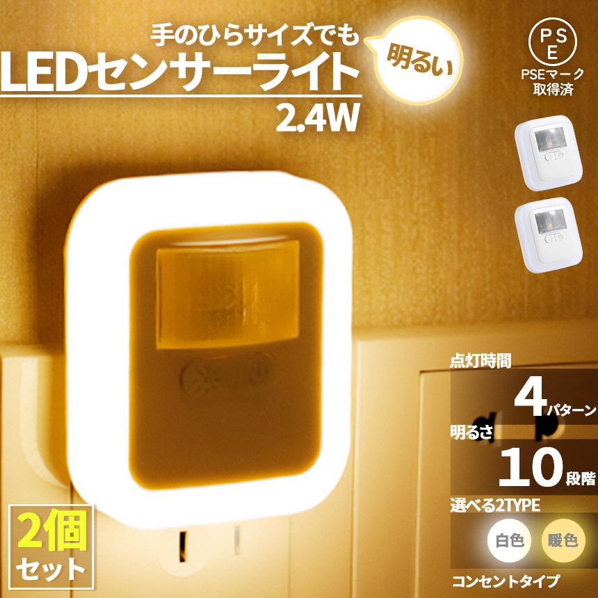 ■センサーライト フットライト 人感 2個セット コンセント式 室内 明るさ調節 点灯時間設定 足元灯 省エネ フットライト 電球色 暖色 白色