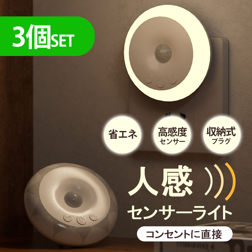 ■センサーライト 人感センサーライト 3個セット コンセント フットライト 屋内 屋外 人感センサー 調光 明るさ 調整 調節 タイマー 自動点