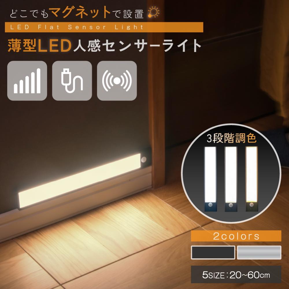 人感センサーライト ■高感度・広角センサー内蔵 暗くなるとモーションセンサーが起動。 人が通ると自動的に点灯してくれます。 検知範囲は150°と広角仕様で、 3〜6mまで検知が可能です。 ■点灯時間もらくらく調整可能 点灯時間は30・60・90・120秒から、 明るさは10段階から設定可能。 使用シーンに合わせて最適な設定を お選びいただけます。 ■省エネ設計 長寿命でお財布にも優しい設計。 1時間当たりの電気代は約0.06円とコスパ抜群です。 ■色温度は2種類展開 柔らかな雰囲気の暖色 鮮やかに照らす白色 ご利用シーンに合わせてお選びくださいませ。 定格出力:2.4W 定格電流:140m A 定格電圧:100-240V、50Hz/60Hz 色温度:3000K 光源:1.2×0.2W(LEDモジュール)