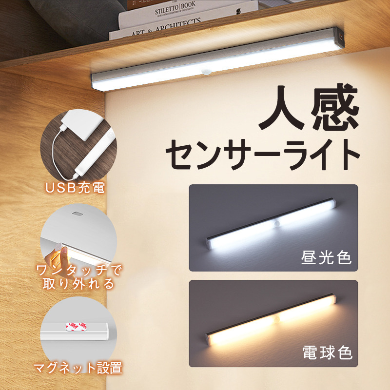 【3色設定可能 & 調光機能】3色: 電球色、昼白色、昼光色。いつもお好きな照明色を選択できます。【調光機能付き】 10%-100%の照明輝度を調整可能【大容量電池 & USB充電】350mah大容量のリチウムイオン電池を搭載しており、USBケーブルで充電でき、電池交換の面倒もないし、配線やコンセント接続の必要もありません。※注意:充電時にセンサーモードをオンにしないでください。充電中センサーモードを起動すると、センサーが壊れる恐れがあります。【高敏度内蔵センサーライト】最先端の高感度光センサーを搭載。120°左右3-5m以内の動体検知してライトが点灯し、約20秒後に動体が検知されない場合は自動に消灯します。注意:この製品はその感知機能を最適化しており、センサーは非常に敏感です。明るい場所では、(同じ場所にライト2本を設置する場合、一つのライトが点灯すると、環境が明るいためもう一つライトのセンサーが感応できなく点灯しないことになります。)誰かが検出範囲に入ってもライトは点灯しません。しかし、暗い場所では、3-5m以内に誰かや動物が動いている限