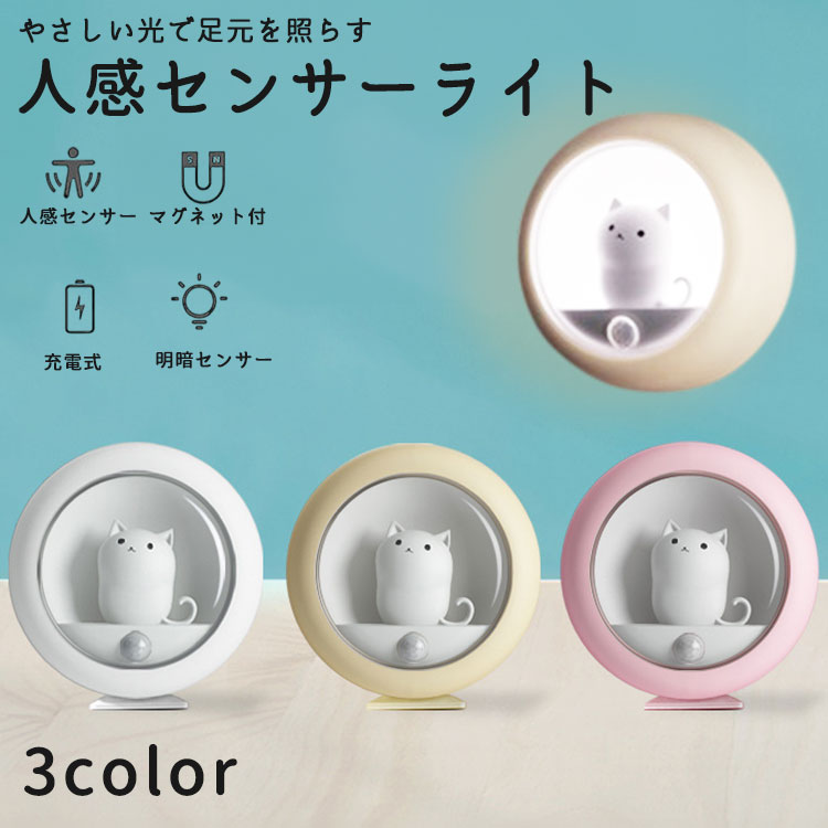 ■ねこ 猫 キャット フットライト 充電式 人感センサーライト 明暗センサー マグネット 常時点灯 明るさ調節 かわいい 磁石 照明 階段 廊下
