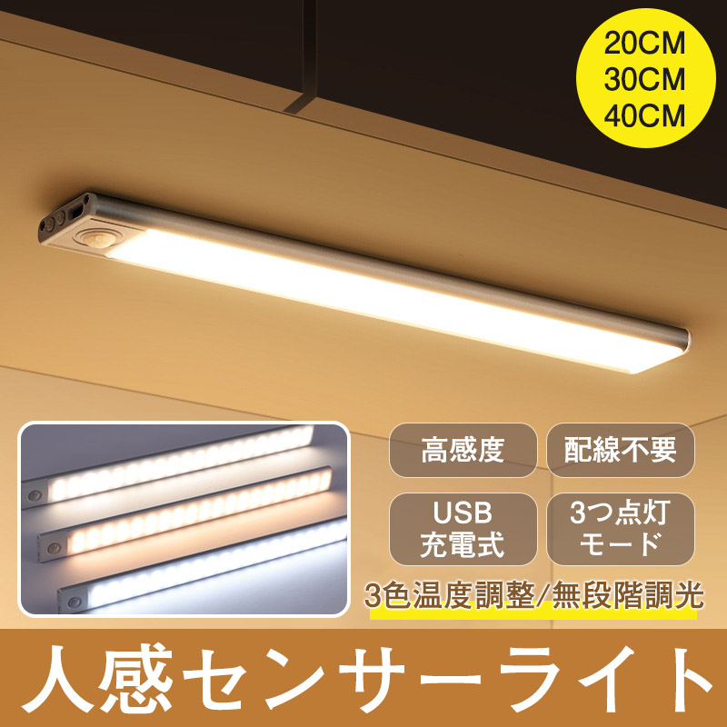 【3色設定可能 & 調光機能】3色: 電球色、昼白色、昼光色。いつもお好きな照明色を選択できます。【調光機能付き】 10%-100%の照明輝度を調整可能【大容量電池 & USB充電】350mah大容量のリチウムイオン電池を搭載しており、USBケーブルで充電でき、電池交換の面倒もないし、配線やコンセント接続の必要もありません。※注意:充電時にセンサーモードをオンにしないでください。充電中センサーモードを起動すると、センサーが壊れる恐れがあります。【高敏度内蔵センサーライト】最先端の高感度光センサーを搭載。120°左右3-5m以内の動体検知してライトが点灯し、約20秒後に動体が検知されない場合は自動に消灯します。注意:この製品はその感知機能を最適化しており、センサーは非常に敏感です。明るい場所では、(同じ場所にライト2本を設置する場合、一つのライトが点灯すると、環境が明るいためもう一つライトのセンサーが感応できなく点灯しないことになります。)誰かが検出範囲に入ってもライトは点灯しません。しかし、暗い場所では、3-5m以内に誰かや動