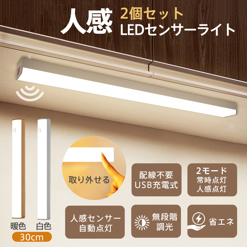 ■商品名■LED センサーライト 2個セット■商品説明■配線いらずなので使用場所を選ばない人感センサーライト。クローゼットや階段下の物置など灯りが欲しい場所での使用もオススメ。裏面にはマグネットが内蔵されており、金属であれば簡単取り付け、取り外しが可能。付属のマグネットシールを使えば玄関の靴入れに貼り付けるなど工夫次第でより便利にご使用いただけます。明るい場所ではセンサーが作動せず、充電を消費しないので安心。使い方も簡単ボタンを一回タップ:常灯モードもう一回タップ:センサーモード更にもう一回タップ:オフモードボタンを長押し:光量の調整が出来ます。商品仕様ライト:白色 / 暖色製品サイズ:220 x 24 x 19mmセット内容:ライト本体 充電ケーブル 設置用マグネット (各2個) 日本語説明書付き■注意事項■※画像はイメージ画像になります。実際のサイズは製品サイズをご確認ください。※画像は、ご覧になっているモニターやPCなどの環境により、実物と多少カラーが異なる場合がございます。色味やサイズが異なるなどのクレームはご対応致しかねますので、ご了承ください。
