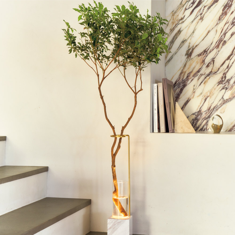 植物を光で美しく照らす革新的なフロアランプ。枝ものや大ぶりの花材を付属の花瓶に入れ、下からLEDでライトアップすれば、植物の陰影が壁や天井に広がり癒しの空間を演出する、フラワーベース兼間接照明です。