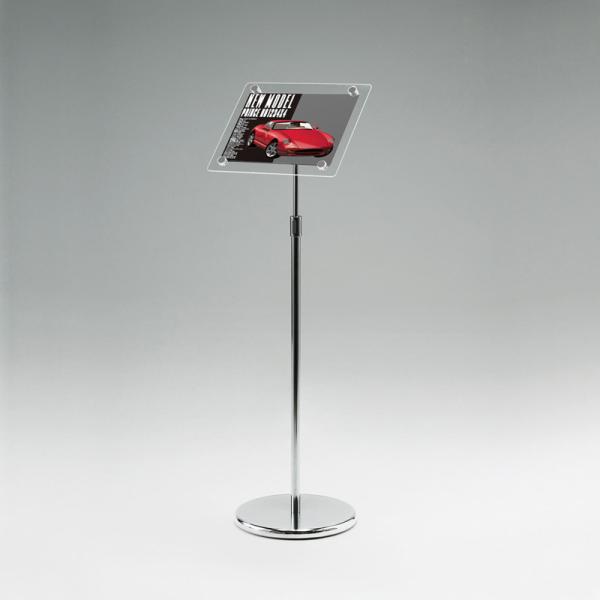 フレームレスでポスターがキレイに引き立ちます。高さ・角度の調節が可能です! アタッチメントと透明アクリルのデザインがおしゃれ。 ベースもポールもクロムメッキ(ベースはヘアライン仕上)で高級感あり。 イメージを大切にする場所にお使いください。 ・クリアなデザインが新鮮なメッセージスタンド ・フレームレスで表示がキレイに引き立ちます。高さ・角度の調節が可能 ・ショールームなどでの展示案内におすすめ 【ご注意】 ※ゆるみ防止のため、ポールとベースの固定に固着剤付きネジを 使用していますので、いったんネジを締めるとはずしにくくなります。 ※直射日光下では、熱により面板が変形することがあります。 設置場所にご注意ください。 ※規格サイズのみとなります。