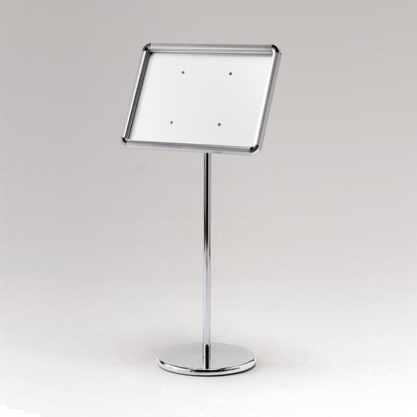 1台で高さ・角度の調節して使えるフロアスタンド フレーム4辺開閉式の案内スタンド。 1台で直立・傾斜に角度調節して使えます。 高さもH980〜1520mm(A3タテの場合)まで調節して使えます。 ベースとポールはクロムメッキ(ベースはヘアライン仕上)の高品質タイプです。 ・1台でタテ・ヨコ・角度を調節して使えるフロアスタンド ・入れ替え簡単な4辺開閉式のスリムフレーム ・お手頃価格、飲食店・物販・サービス施設で使えます。 【ご注意】 ※フレームは「ポスターフレーム333」と同様です。 ※ゆるみ防止のため、ポールとベースの固定に固着剤付きネジを 使用していますので、いったんネジを締めるとはずしにくくなります。 ※直射日光下では、熱により透明板が変形することがあります。 設置場所にご注意ください。 ※規格サイズのみとなります。