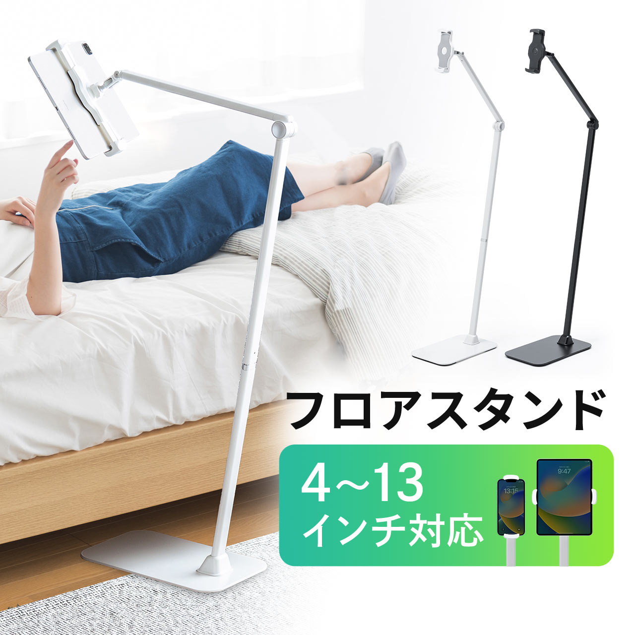 i Padやタブレットの設置に最適なタブレット用フロアスタンド。場所を選ばず使える床置きタイプ。角度は自由に調整できるので、ベッドで寝ながらYou Tubeなどの動画視聴も可能。オフィスでの受付用としても使用可能。4〜13インチまでの対応なので、スマホも設置可能。ブラック。【WEB限定商品】サンワサプライ直営通販サイト:サンワダイレクト