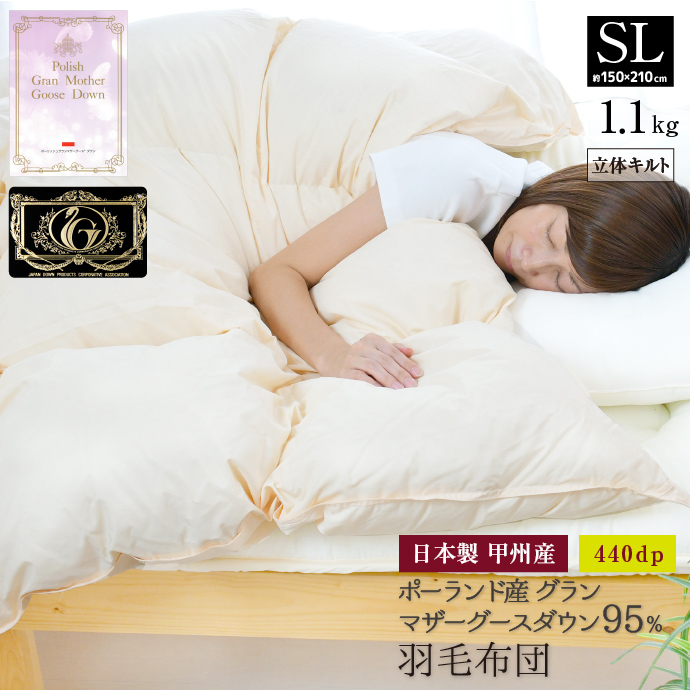 ■羽毛布団 シングル 日本製 ポーランド産 マザーホワイトグース ダウン95% 1.1kg プレミアムゴールドラベル 国産 甲州 立体キルト 綿100