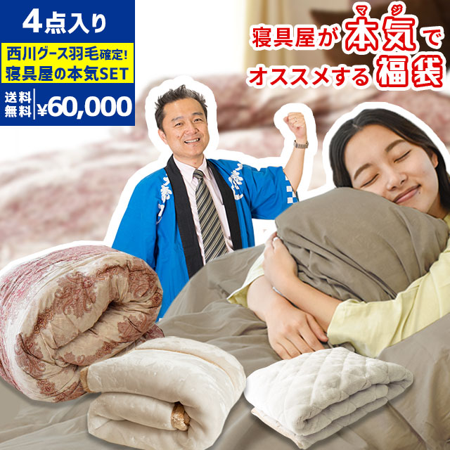 ■福袋 開運★2023年福袋 西川 マザーグースダウン 羽毛布団 + メガオーロラ 毛布 + メガオーロラ 敷パッド + 和晒 掛けカバー 4点セット