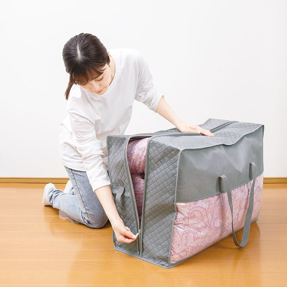 ガバッと開いて収納しやすく、持ち手付きで取り出しやすい炭シートを内蔵ダブルファスナーで開閉もスムーズ収納目安はシングルサイズの羽毛布団1枚です