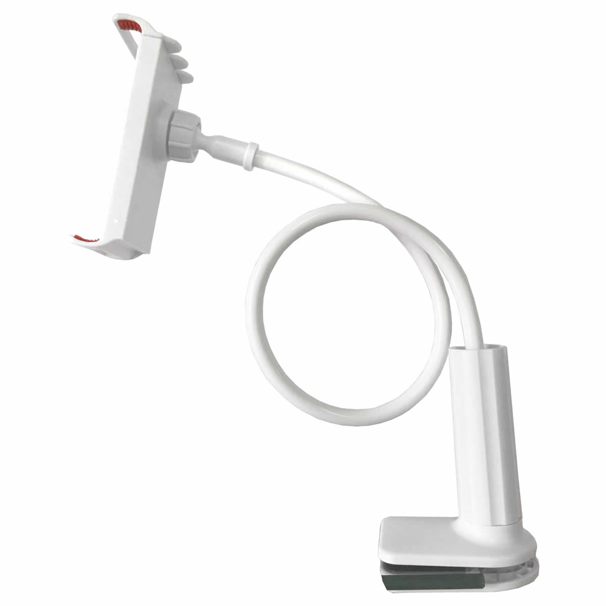 Lazos タブレット用 アルミ合金アームスタンド ホワイト商品型番L-TAA-WJANコード4571414155120仕・様机やベッドに固定する台座部分がクランプ式で、女性やお子様の力でも楽に取り付け可能 なアームスタンドです。台座部分は上下ともすべり止めクッション材付きで、取り付け場所を保護&しっかり固定できます。アルミ合金の軽量アーム、全長約70cmのアームはフレキシブルに調整可能で、端末を挟むヘッド部は360度回転できます。ヘッド部分は伸縮式ホルダーで、タブレット幅130〜180mmに対応可能です。・本体素材:ABS & アーム部[鉄/鋼]・アーム長さ:約60cm(全長:約70cm)・本体重量:約240g・本体カラー:ホワイト・対応サイズ:タブレット幅180mmまで・伸縮式ホルダーサイズ65*120mm(最大180mm)・台座サイズ:11×55mm、開口幅 65mm・メーカー リーダーメディアテクノ(株)