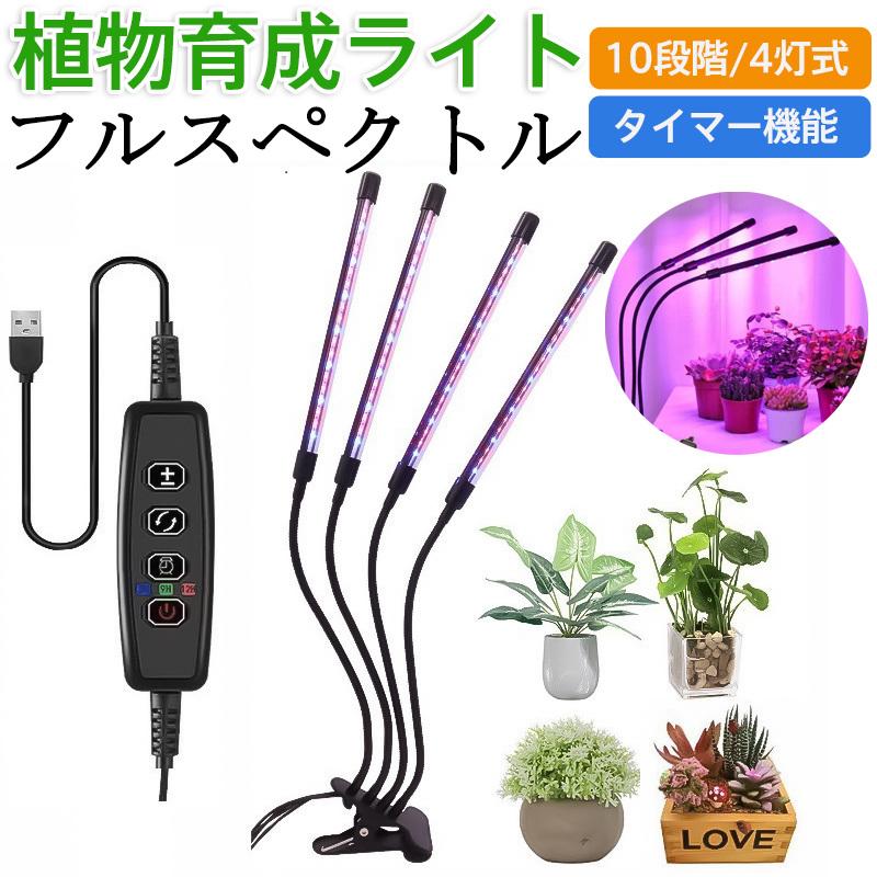 植物育成ライト LED植物育成灯 室内栽培ランプ クリップ式 4灯 スタンド 9段階調光 3つ照明モード USB タイマー 観葉植物 360度アーム