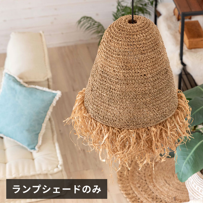 ■対応ソケット:Aタイプ ■サイズ:約 W 40 × D 40 × H 60(フリンジ部分含む) ※多少サイズは前後します。 ■重量:約 1.4 kg ■素材:本体:パーム・シーグラス・スチールフレーム、フリンジ:ラフィア ■生産国:インドネシア ■ご注意 ※当商品はシェードのみです。ソケット・電球は付属していません。 ※電球は別売りです。(熱くならないLED電球推奨) ※ハンドメイドですので、写真とデザインや色合いが多少異なる場合がございます。 ※天然素材特有の小さなキズやヒビ・色むら等はご了承ください。 ※天然素材のため経年劣化とともに変色することがございます。 ※天然素材を使用しているため、ささくれ等がある場合がございます。持ち運びの際は十分お気を付けください。 ※電球は熱くならないLED電球のご使用を推奨します。また燃えやすい素材のため火器類近くでのご使用をお控え下さい。