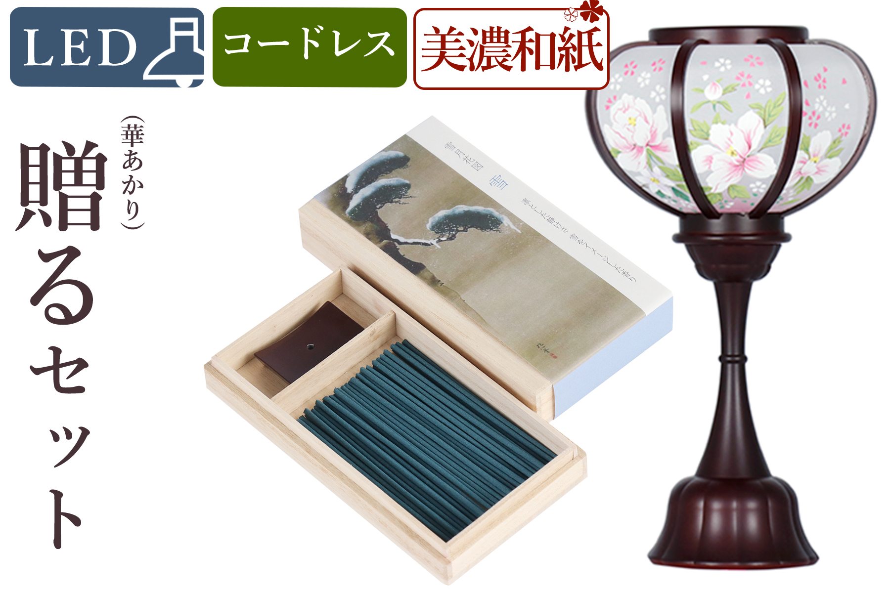 ■盆提灯 初盆 新盆 モダン 仏具 線香 贈る セット 雪 岐阜の誉れ シリーズ 華あかり LED コードレス 電池式 ミニサイズ 提灯 仏壇 仏花 贈