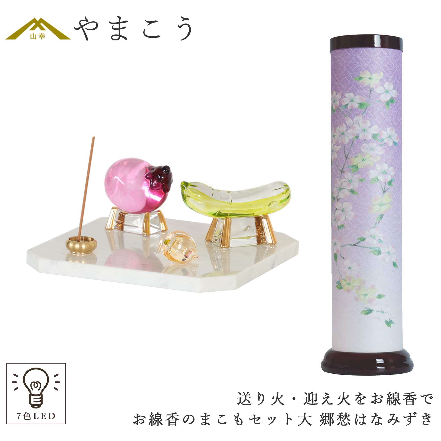 迎え火・送り火に「香る線香」を灯す。 天然大理石の美しい光沢と、質感。火の元に不安がなく、美しくお盆飾りができます。ガラス製の精霊馬、精霊牛とほおずきは、クリスタルの輝き。伝統的な真菰セットを愛らしくアレンジ、毎年使える耐久性もうれしい、機能美あふれる一式です。 2種類のLED電球が組み込まれ、灯明の色彩が七色に変化していくとても美しい、逸品。最新のLED照明技術が組み込まれた製品です。火袋は和紙の雰囲気、台座部分は漆塗りに似た光沢のある丁寧な仕上がり。人気の「光触媒コーティング」の製品となります。 【盆提灯コードタイプ】 電装コード(ダイヤルスイッチ付き) 【サイズ 約(cm) 】 盆提灯:高さ48 径13.5 精霊馬:高さ5.5 幅9.5 精霊牛:高さ6 幅7 ほおずき:高さ2.5 幅3.5 大理石の香皿:高さ1 幅18 奥行18 お香立:高さ1 幅2.5 お線香ガラス瓶:長さ16(お線香 9) ※こちらの商品は、お盆提灯「郷愁はなみずき」1本単品とお線香のまこもセット(大サイズ)を合わせたセット販売となります。