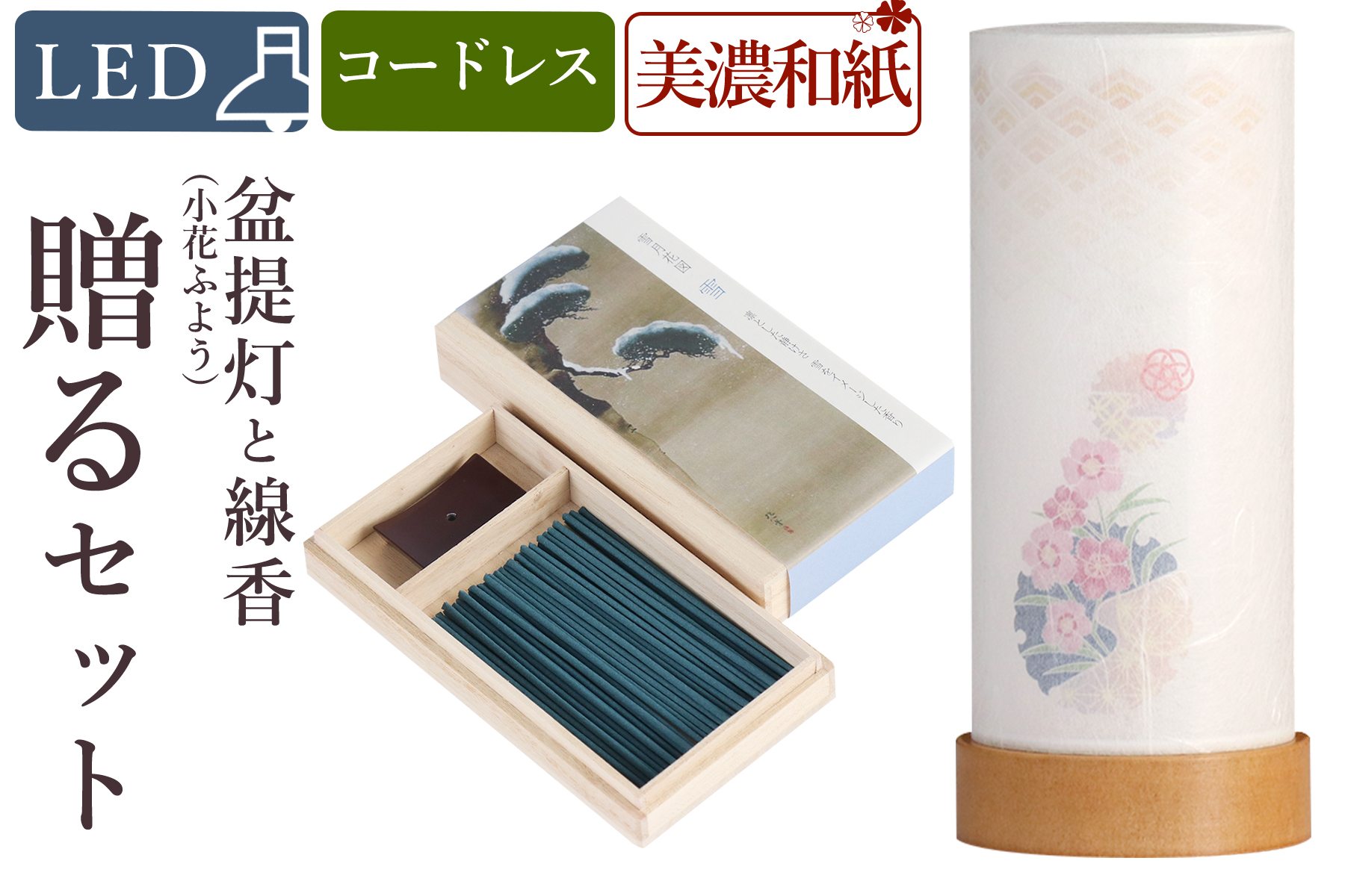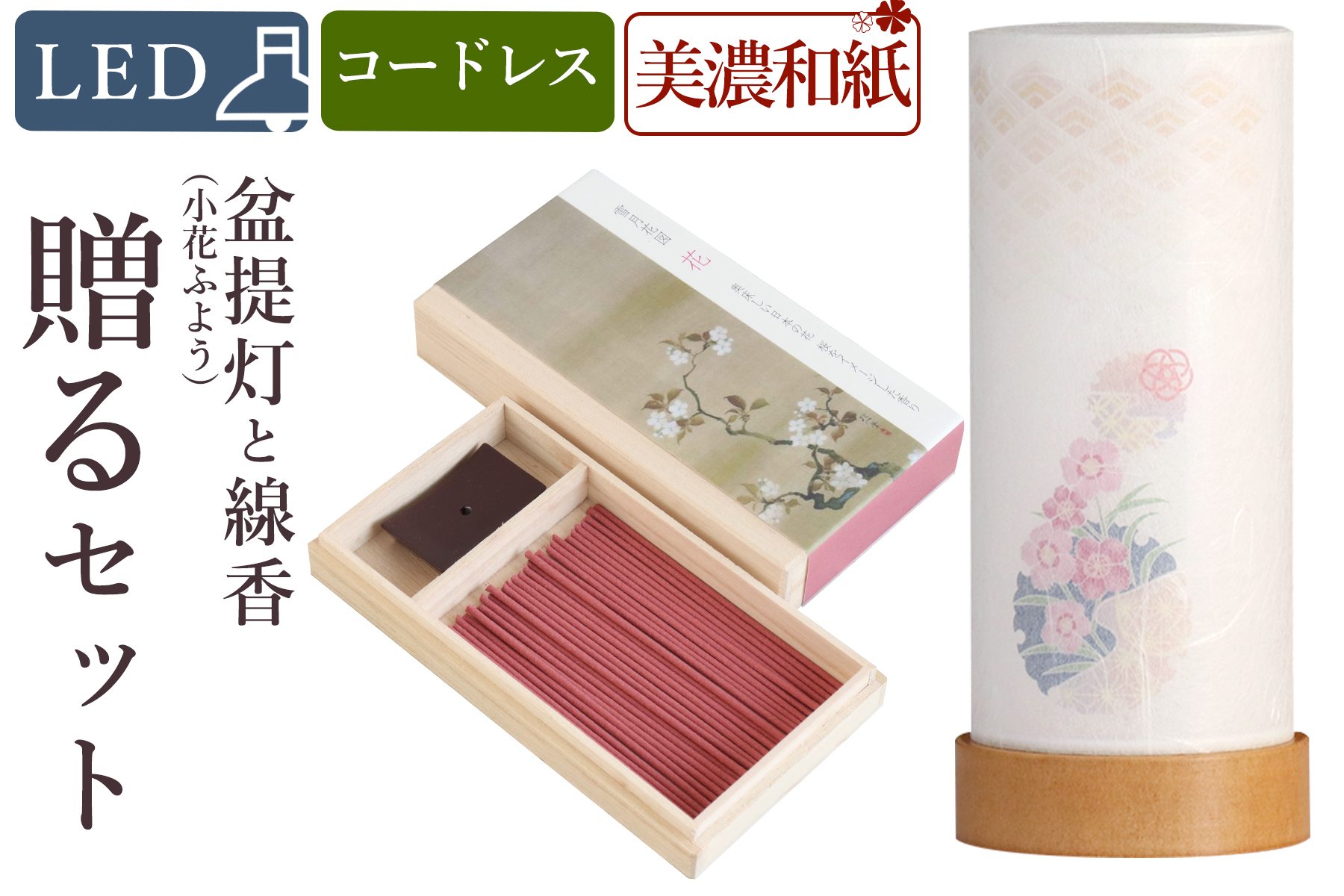 ※ こちらの製品は季節商品のため、今季限りの限定出荷品となります。当店在庫品ですので迅速にお届けいたします! 大切な方へのギフト・贈り物としておすすめの盆提灯とお線香セットとなります。 人気のコードレス・LED・ミニサイズのお盆提灯と桜をイメージした香りのお線香を組み合わせた当店オリジナルの組み合わせ。 提灯は、お盆の時期だけでなく、一年中美しく灯せるインテリア照明として、和室はもちろん洋室にも、お部屋の雰囲気を問わず設置できるモダンなデザイン。 桐箱入りのお線香は、お香としてもお使頂けるよう桜の花をイメージした香りをセレクトさせていただきました。 お供えとしてだけでなく一年を通してお使いいただける、贈る人を選ばない人気のセットです。 こちらの商品は盆提灯1本単品と線香のセット販売となります。 【盆提灯コードタイプ】 コードレス(単3電池2本付属) 【サイズ 約(cm) 】 お盆提灯:高さ18.5 径8 桐箱:高さ2.2 幅7.5 奥行13.8 お香:長さ6.5 香立:高さ0.65 幅4 奥行2.3