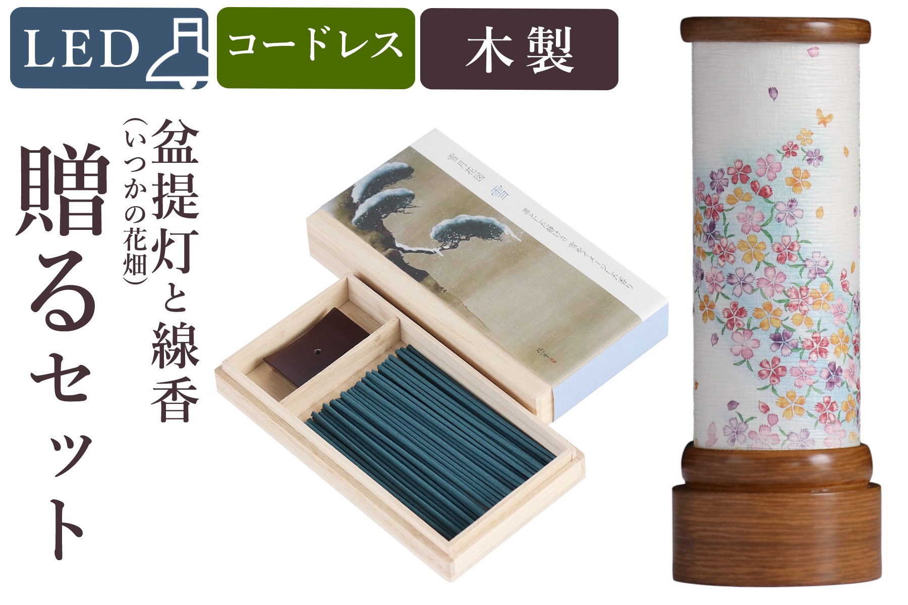 ■盆提灯 初盆 新盆 モダン 仏具 線香 贈る セット 雪 八女・移ろいの夏 シリーズ いつかの花畑 ミニ 電池式 コードレス LED 小型 和 行灯