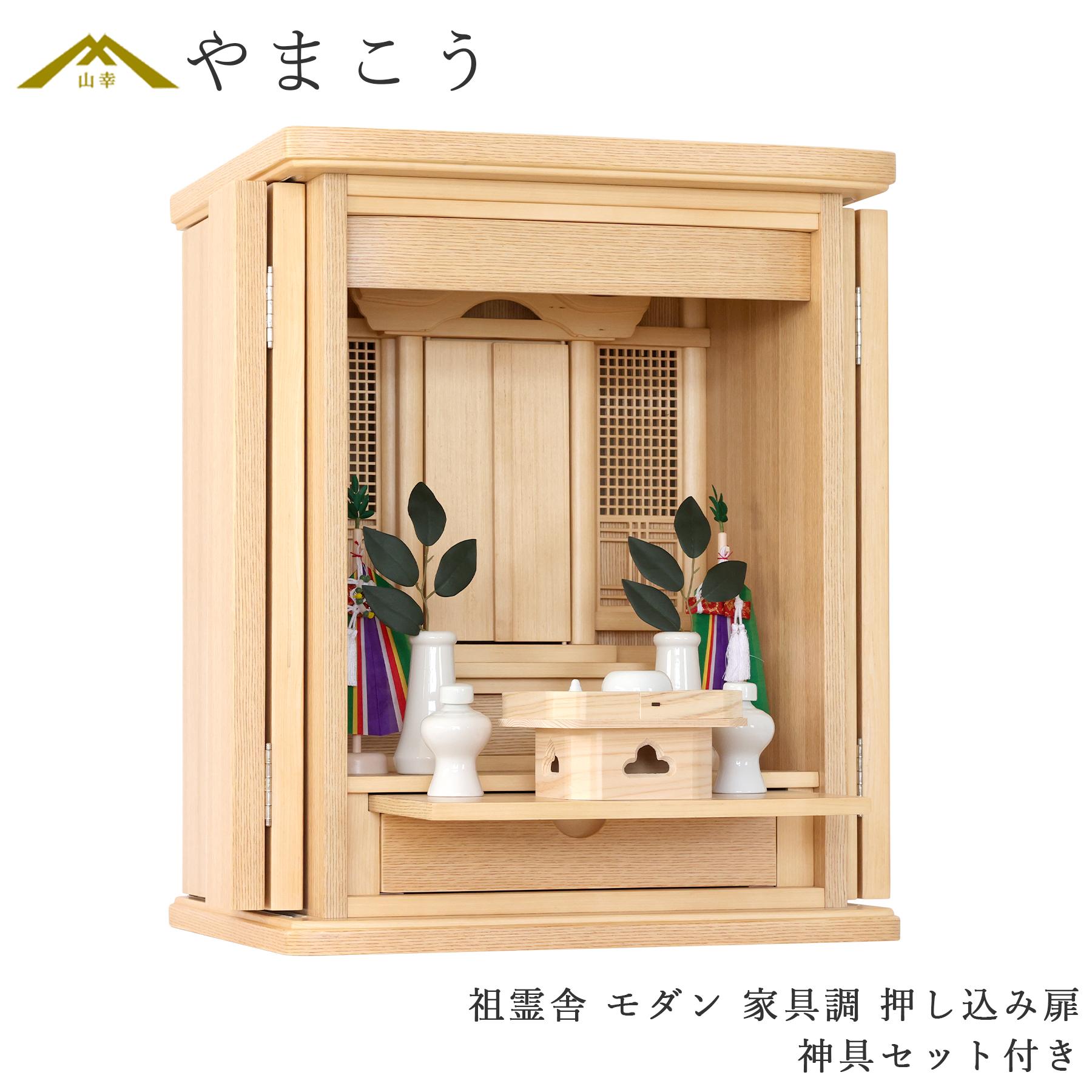 ■祖霊舎 神徒壇 神具付き モダン 家具調 上置き型 スライド扉 ミニ コンパクト タモ カラー 高さ60cm 幅48cm 神道 祖霊社 セット (代引き