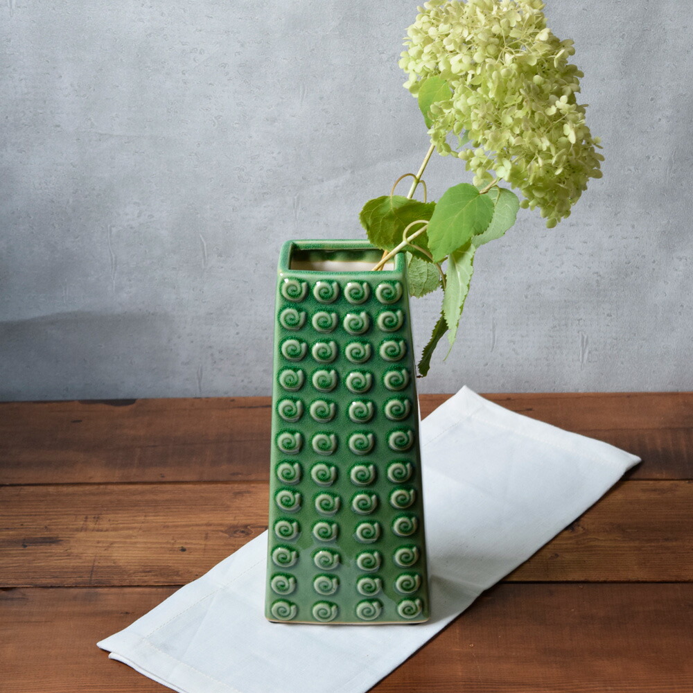 商品説明 鮮やかなグリーンと個性的なフォルムが目を引くおしゃれな陶器の花器です。 水アカなどが目立たないのも嬉しいポイント。 お花を生ける花器にはもちろん、花瓶だけで飾ってオブジェとしてもおすすめです。 玄関やリビングのインテリアに、食卓にお料理と一緒に並べたりなど、テーブルコーディネートが楽しくなるインテリア雑貨です。 商品詳細 サイズ/口径W8.9×D6×高さ28cm 重さ/約1186g 素材/陶器 質感/つややか 生産地/中国 ※サイズは全て外寸になります。 ※サイズ・重さなどは商品により誤差があります。 ご注意 ※お客様のお使いのモニター設定、お部屋の照明等により実際の商品と色味が異なって見える場合がございます。 ※画像に含まれる小物は使用イメージのために使用しています。 ※不明な点がございましたら、お気軽にお問い合わせ下さい。