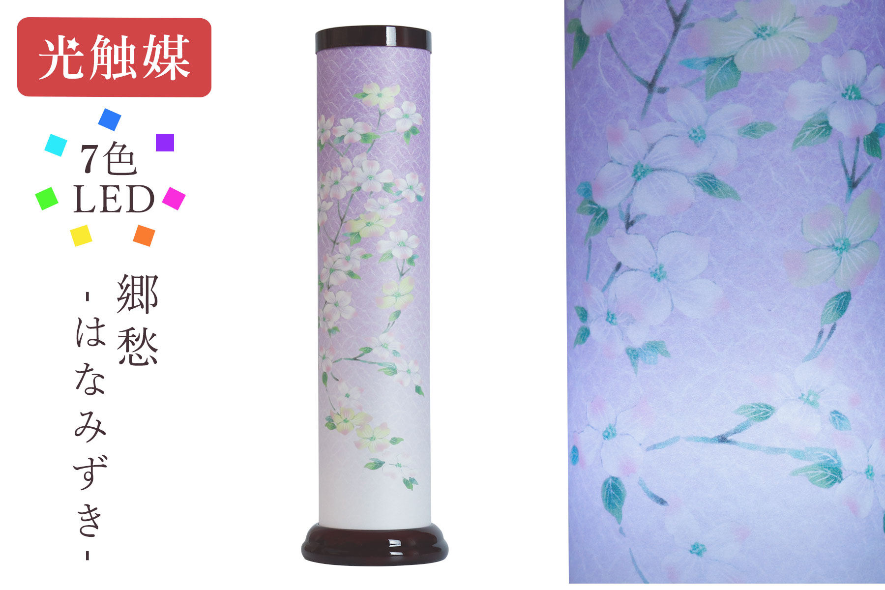 ※ こちらの製品は弊社企画のオリジナル商品です。今季限りの限定品、当店在庫品ですので迅速にお届けいたします!七色に変化する灯火に照らされ、幽玄に浮かぶ「ハナミズキの花」。春夏秋冬を想いめぐり、郷愁に満ちた優しいひと時を演出します。円筒型をしたモダンな雰囲気のお盆提灯は、今では主流の形。火袋は和紙の雰囲気、台座部分は漆塗りに似た光沢のある丁寧な仕上がり。古き良き、お盆提灯のテイストも残しています。人気の「光触媒コーティング」の製品となります。2種類のLED電球が組み込まれ、灯明の色彩が七色に変化していくとても美しい、逸品。最新のLED照明技術が組み込まれた製品です。お仏壇周りだけでなく和室、洋室、フローリングなど場所を問わずフィットするデザイン。一年中美しく灯せるインテリア装飾品としても。■ 備考 ■コードタイプ:ダイヤルスイッチ付き■ サイズ 約(cm) ■高さ48 径13.5