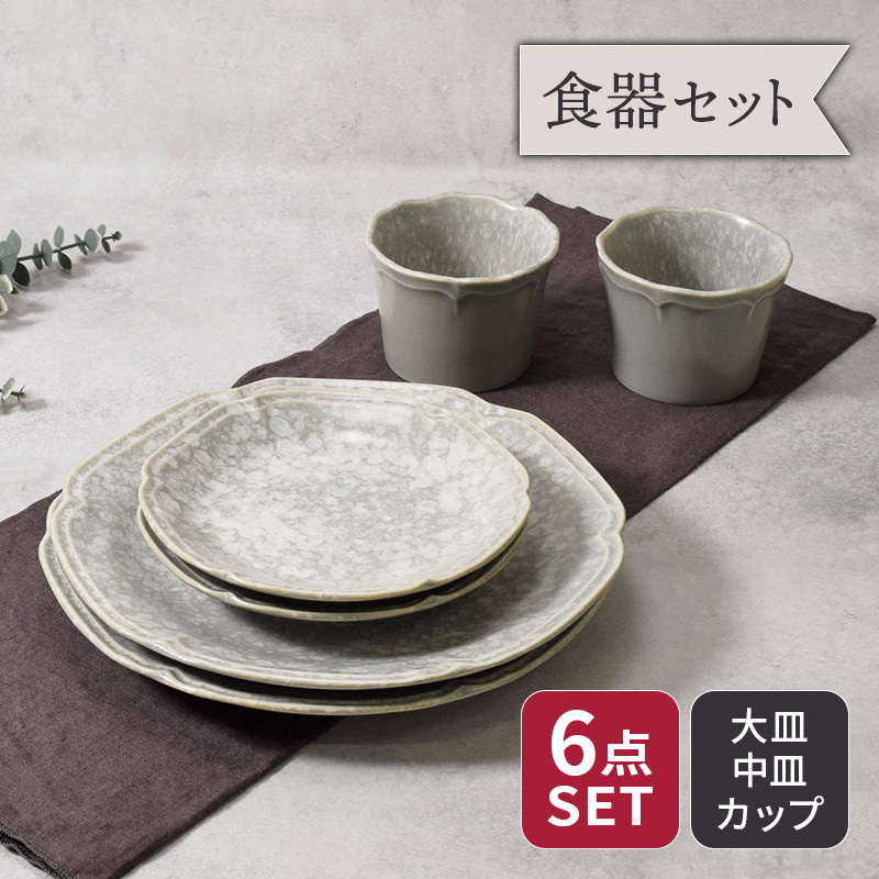 ■プレート 大皿・中皿 & カップ 2人用 6点セット 3種×各2点 細雪 グレー 割引セット 送料無料 福袋 洋食器 おしゃれ モダン 和モダン