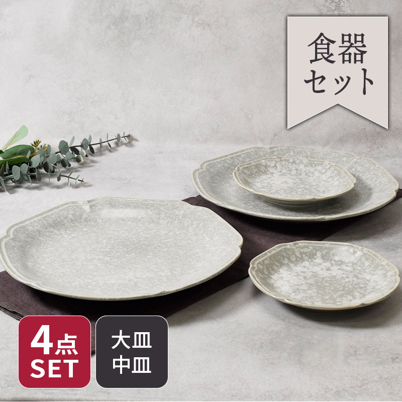 ■プレート 24cm & プレート 14.5cm 2人用 4枚セット 2種×各2枚 細雪 グレー 割引セット 送料無料 洋食器 おしゃれ モダン 和モダン シ