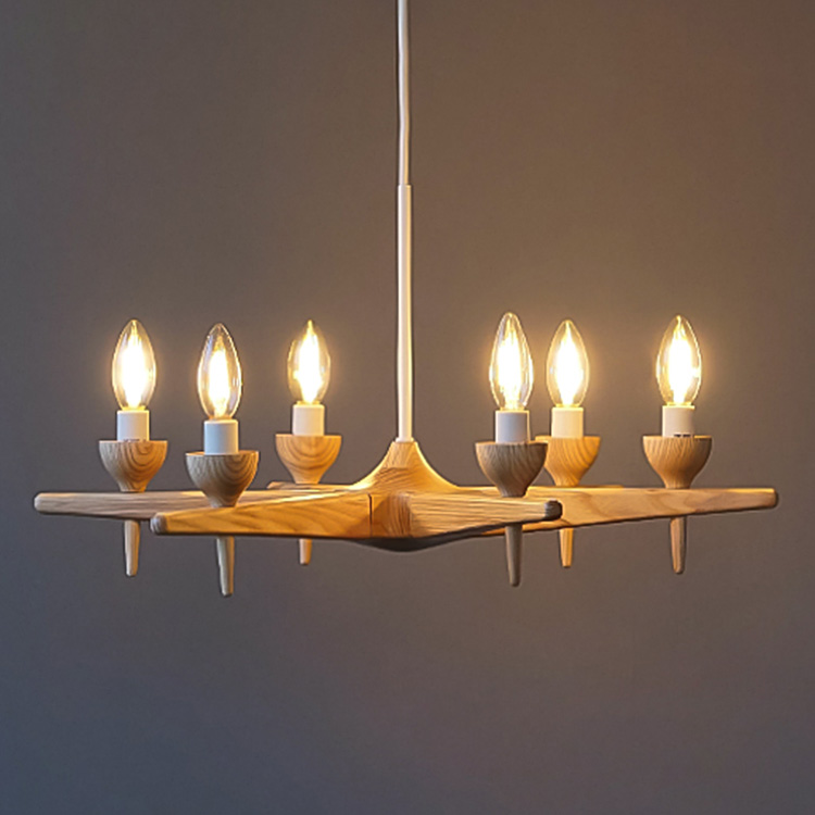 懐かしさとモダンさを両立した、インテリアの主役級アイテムとなる木製6灯シャンデリア「スロイド」。まるで手で削り出したような曲線的なフォルムと天然木の風合いを生かした素の色合いは、シンプル・ナチュラルなインテリアに馴染みます。6灯タイプは広い空間にも負けない大型サイズで、ダイニングの照明として使用するのはもちろん、リビングや吹き抜けなど天井の高い場所にもマッチします。コード長は約100cmと長めになっているので、天井が低い場所では別売りのコードアジャスターを使用して長さを調節してください。別途、E17口径のLED電球を6個ご用意ください。サイズ(約):木製部/W510×D588×H107mm、コード/長さ1000×直径5.8mm、全長/1200mm重量:約1.7kg材質:アッシュ材(表面クリアラッカー塗装)、その他※電球は付属しません。※コードの延長、カットなどの加工は承っておりません。※前後30mm以内のコード長誤差は良品の範囲内とさせていただきます。