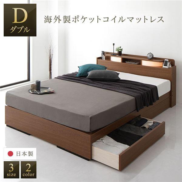 ■ベッド 日本製 収納付き 引き出し付き 照明 宮付き 棚付き コンセント シンプル モダン ブラウン ダブル 海外製ポケットコイルマットレス