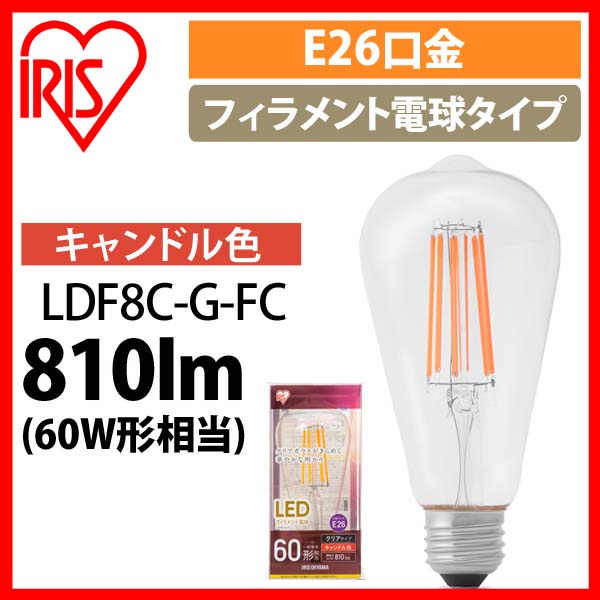 クリアガラスがきらめく華やかな明かりのLEDフィラメント電球です。白熱電球のように全方向に光が広がります。モダンやレトロ調な照明器具に適したインテリア性のあるデザインです。口金サイズがE26口金なので、照明器具を替えることなくご使用いただけます。長寿命約15000時間で、ランプ交換の手間が少ないLEDフィラメント電球です。光色はレトロ雰囲気を演出するキャンドル色です。★LED電球の共通特長★・水銀レス・・・環境に有害な水銀を含みません。・すぐに明るく・・・LEDは電気を流すと発光する半導体なので、スイッチを入れた直後から明るく点灯します。・虫が集まりにくい・・・虫が集まりやすい紫外線領域波長をほとんど出さないので灯具清掃の手間を軽減できます。・ON/OFFに強い・・・LEDは、頻繁なスイッチの入/切による劣化がなく寿命が短くなることはありません。・低UV/低赤外線・・・紫外線や赤外線をほとんど出さないので、紫外線による色あせや赤外線による熱が気になりません。(アイリスオーヤマ)