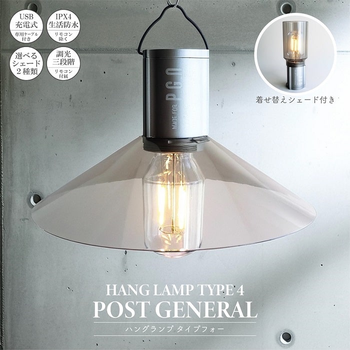 ■照明 LEDランプ ポストジェネラル ハングランプ タイプフォー 2種類シェード/ リモコン付属 USB充電式 3段階調光 生活防水仕様 マグネッ