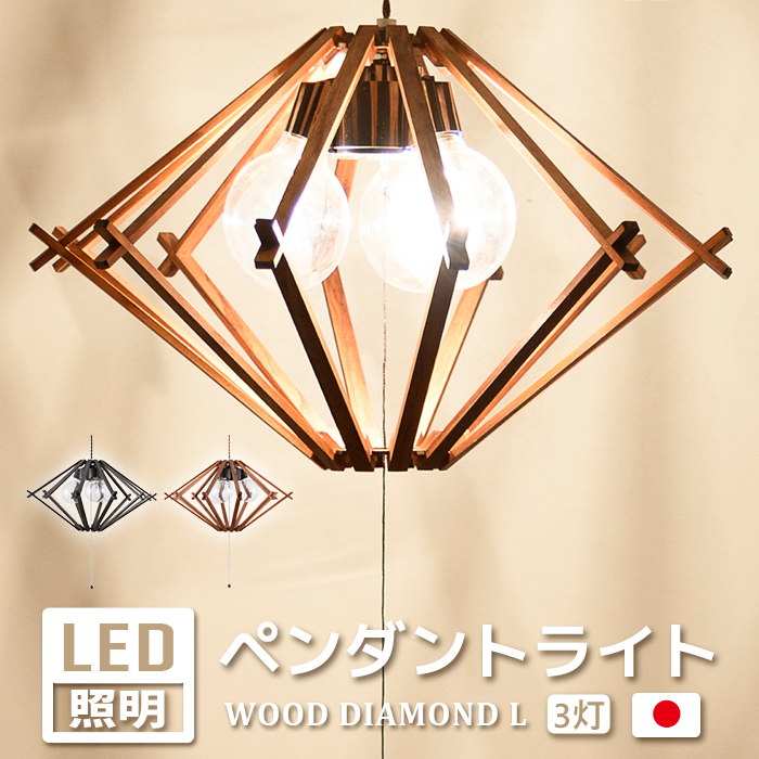 ■ペンダントライト■WOOD DIAMOND ウッドダイヤモンド■LED■カラー:TK、ABKナチュラルな木製の枠をダイヤモンドのように配置しました。中の電球が放つ光が木枠を通して、モダンな光と影を作り出します。全体のフォルムもバランスよく高級感があるので、空間がぐんとオシャレになります。Lサイズはプルコードで電源のオンオフが可能です。(3灯→1灯→ナツメ→消灯)■Lサイズ■サイズ:約幅540×奥行540×高さ300mm、1.0kg■点灯:プルスイッチ(3灯→1灯→ナツメ→消灯)■コード長さ:50cm(ねじり)■電球:E26 LED ボール球 80W相当 クリア(電球色)×3個、ナツメ■取付方法:引掛けシーリング■材質:木■日本製