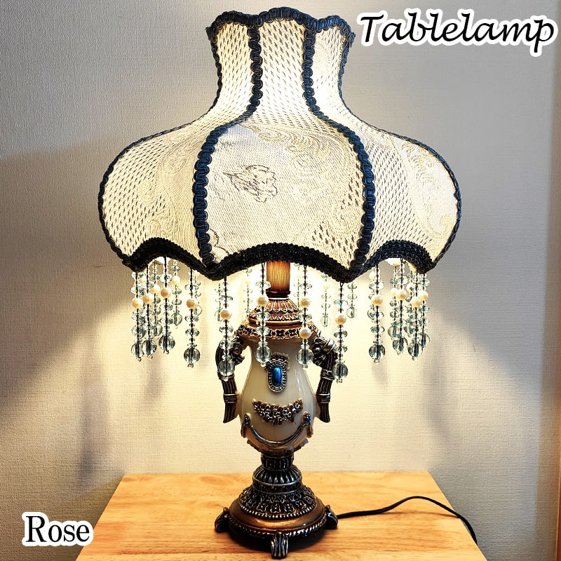 【テーブルランプ ローズ】 上品さと華やかさが魅力的なテーブルランプです。 美しいデザインの布製のシェードとビジューがお部屋にほんのり幻想的な雰囲気を演出します。 お部屋のアクセントにピッタリな逸品。 日中はもちろん、夜間もオシャレな雰囲気を楽しむことができます。 お気に入りの照明で心地よいひとときを過ごしてみてはいかがでしょうか? 嬉しいLED電球付きで、届いてすぐにご使用いただけます。 ワンランク上のインテリアはいかがでしょうか? ■サイズ・容量:容量:Φ33 x H52 cm / 1.4kg コード:165cm(ON/OFFスイッチ有) LED電球:E26 4W ■素材:布、(シェード)、樹脂(土台) ■付属品:LED電球1個/メーカー1年間保証書 ■備考:お使いのディスプレイの設定によっては、 画面上の色と実物の色が若干異なる場合がございます。