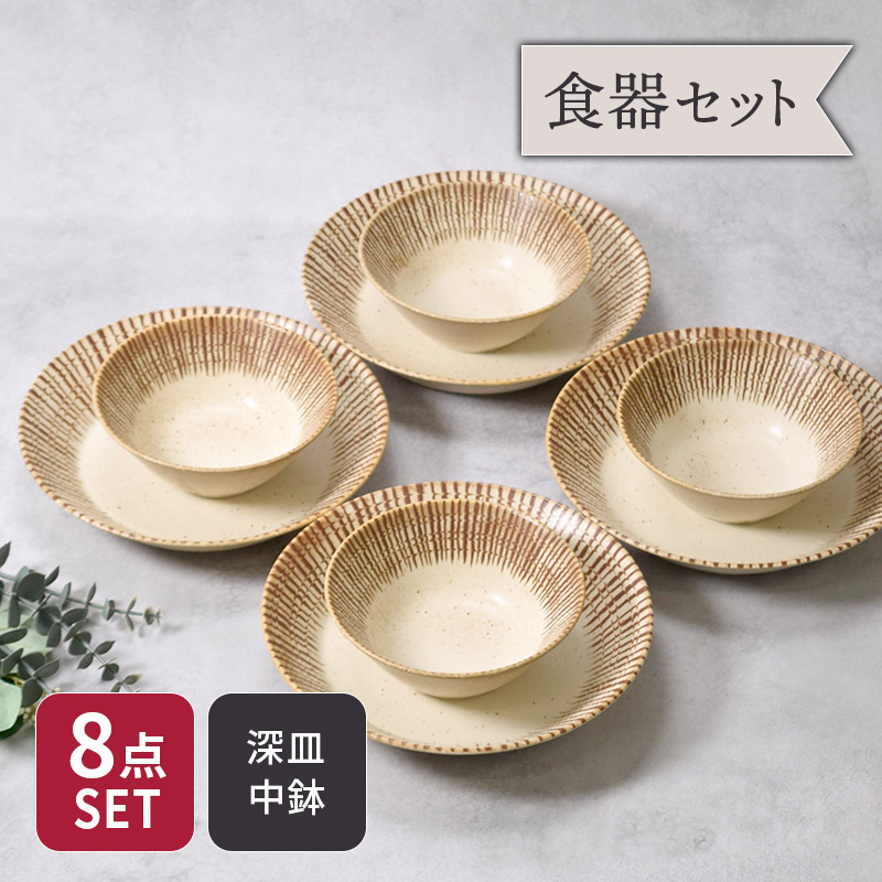 ■カレー・パスタ皿 & 中鉢 4人用 8枚セット 2サイズ×各4枚 チョコストライプ 和食器 割引セット 送料無料 和食器 おしゃれ モダン 和モ